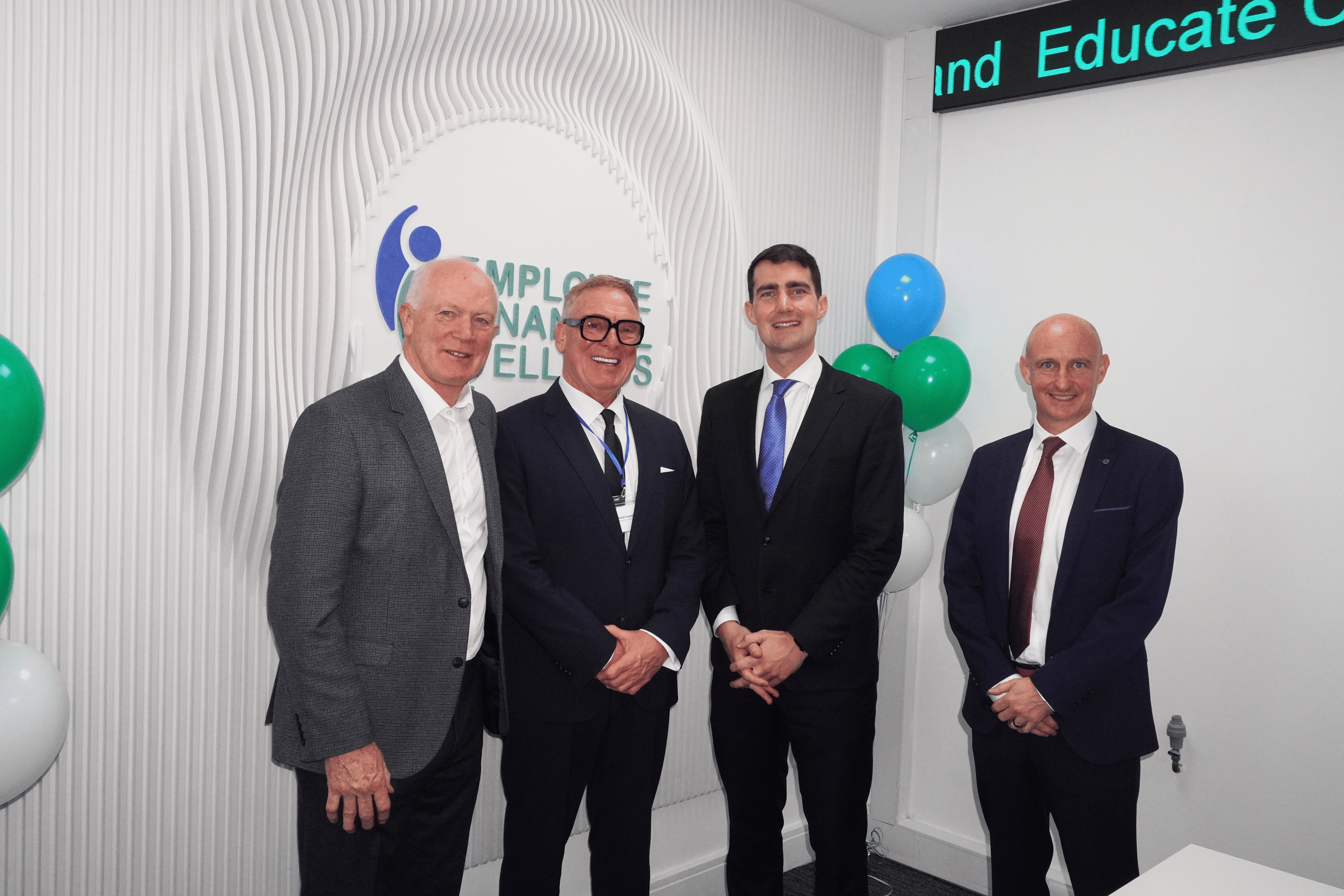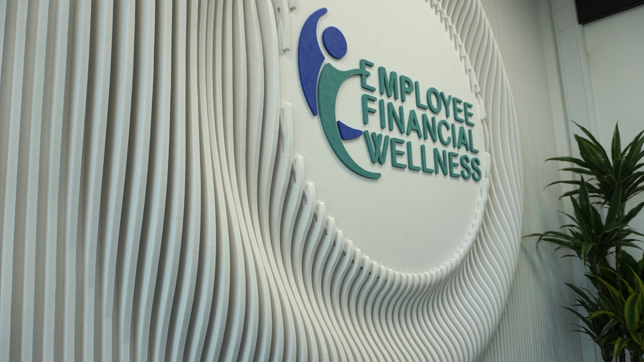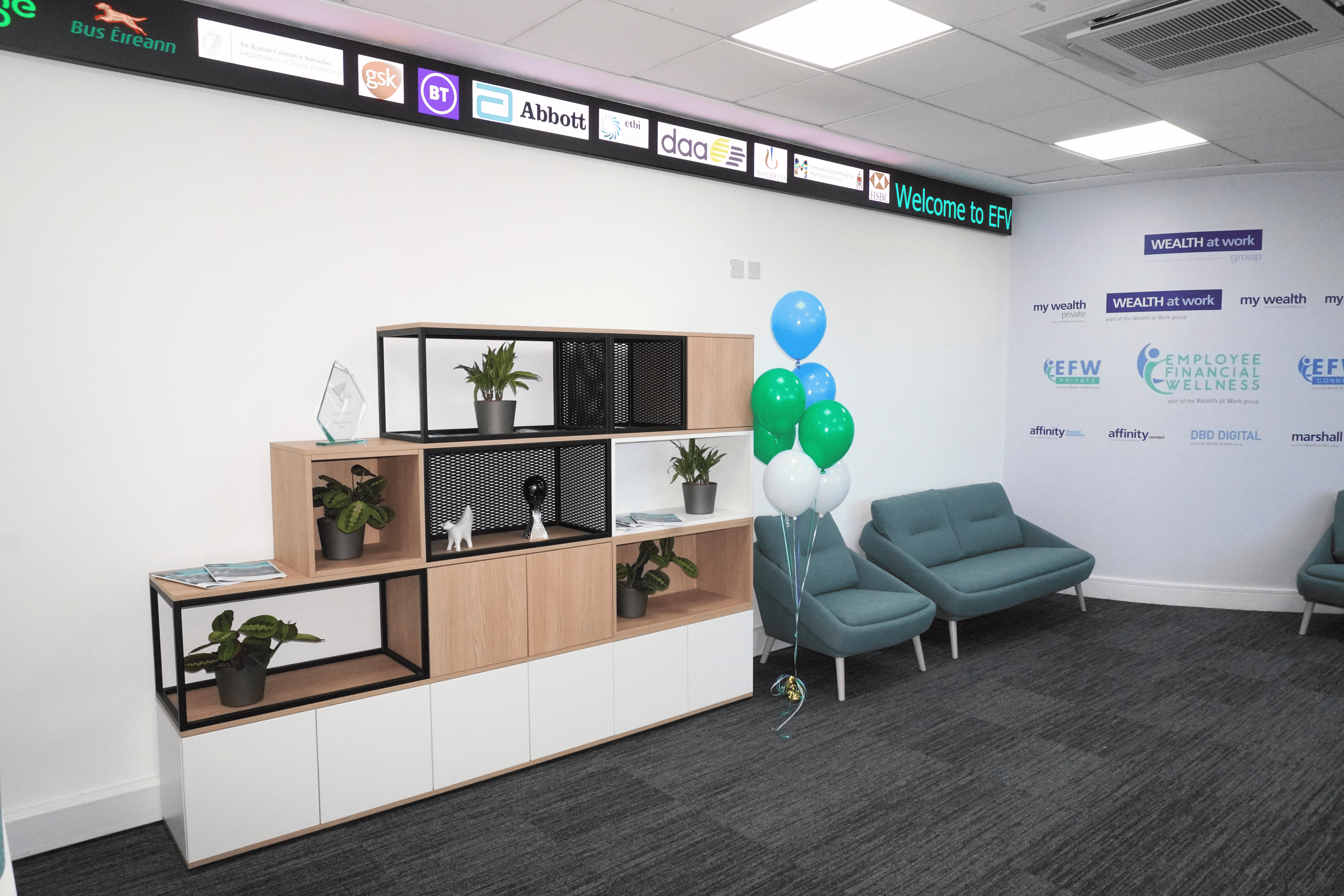 The bespoke acoustic wall installation — crafted to showcase the Employee Financial Wellness logo — ties the space together while enhancing the overall sound quality. The final fit-out also included ergonomic furniture, tailored lighting solutions, and branded detailing throughout.