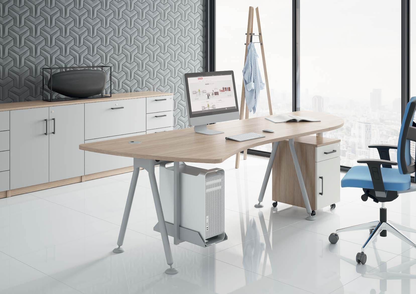 The Geos desk line is characterized by an original and optically light desk frame. A wide selection of table top shapes, which gives an extremely large compositional freedom in the arrangement.