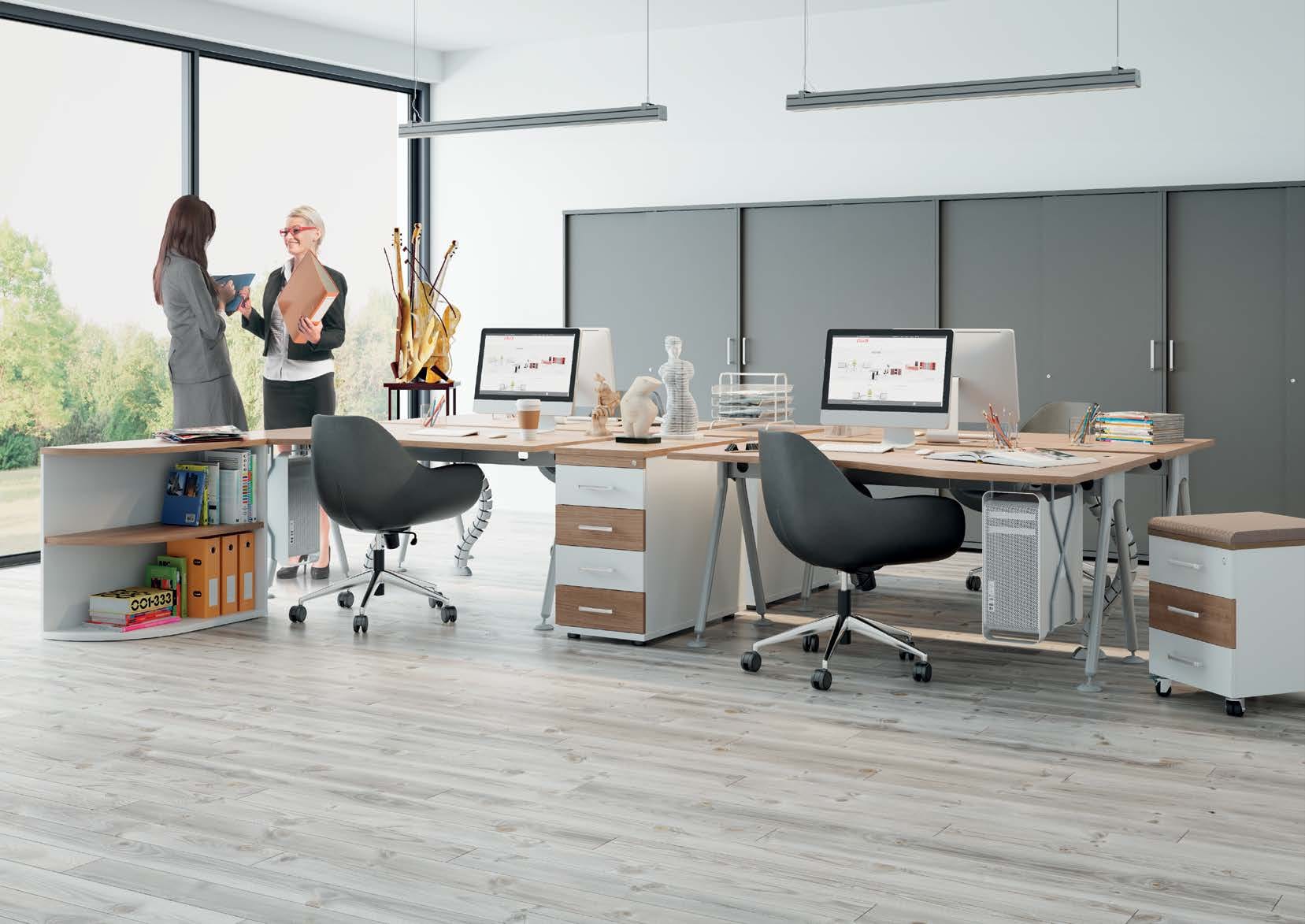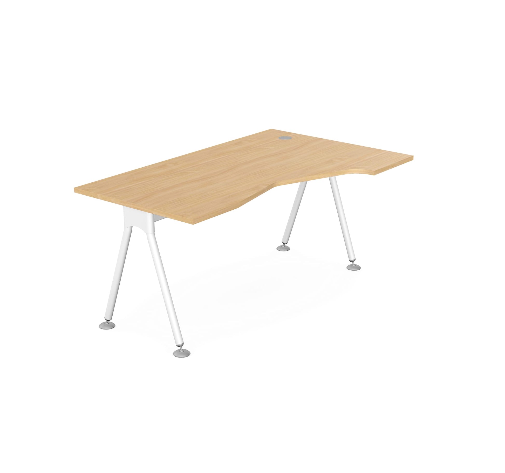 The Geos desk line is characterized by an original and optically light desk frame. A wide selection of table top shapes, which gives an extremely large compositional freedom in the arrangement.