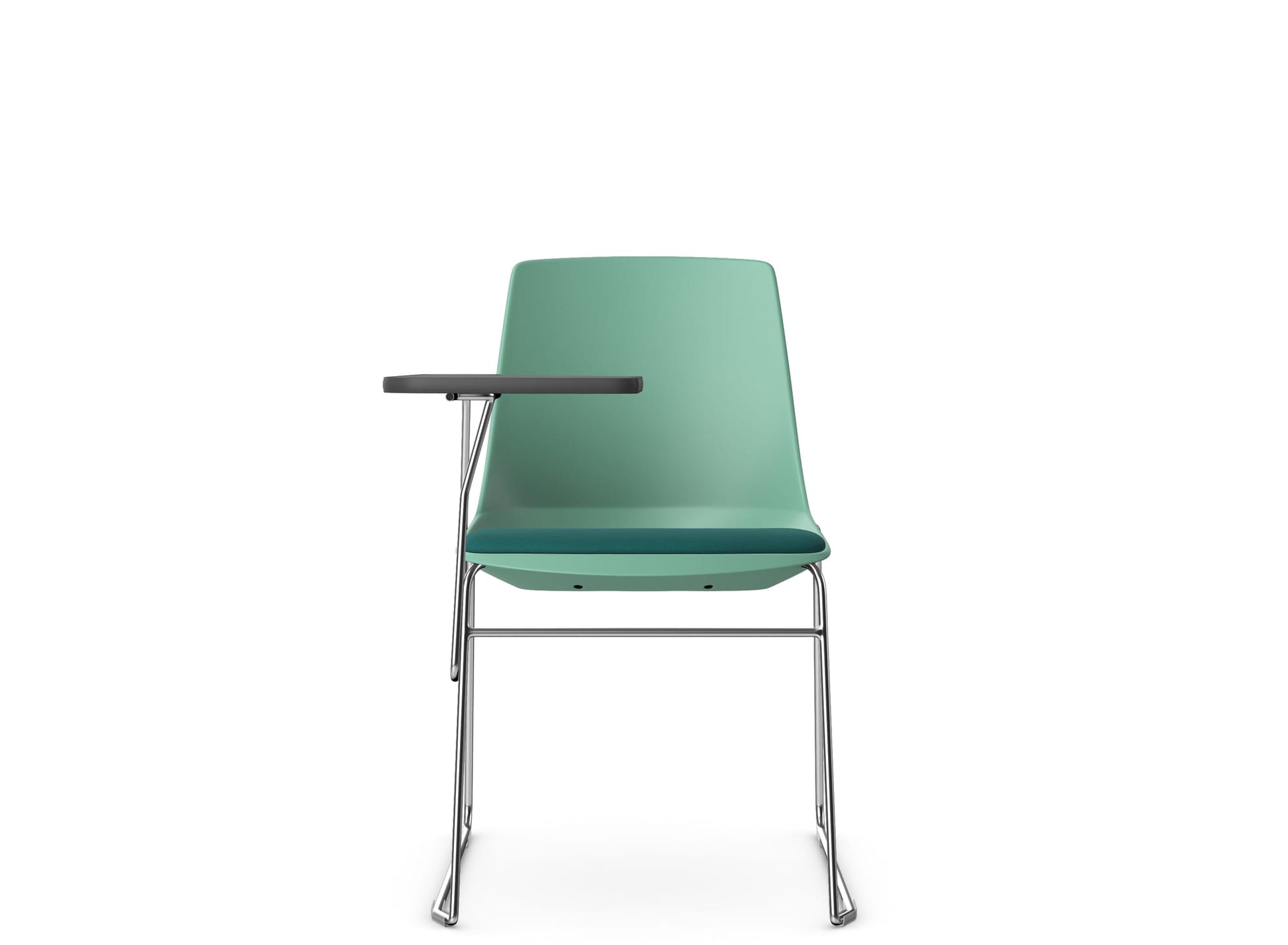 An interesting variant is a chair on a round base with a writing tablet mounted on a swivel joint. This variant is the ideal solution for training rooms. The base offers space for storing a rucksack or bag, and the writing tablet is rotatable so that it can be used in any position and on either side. The tablet swivel joint is made from steel and as an option can be coated with plastic.