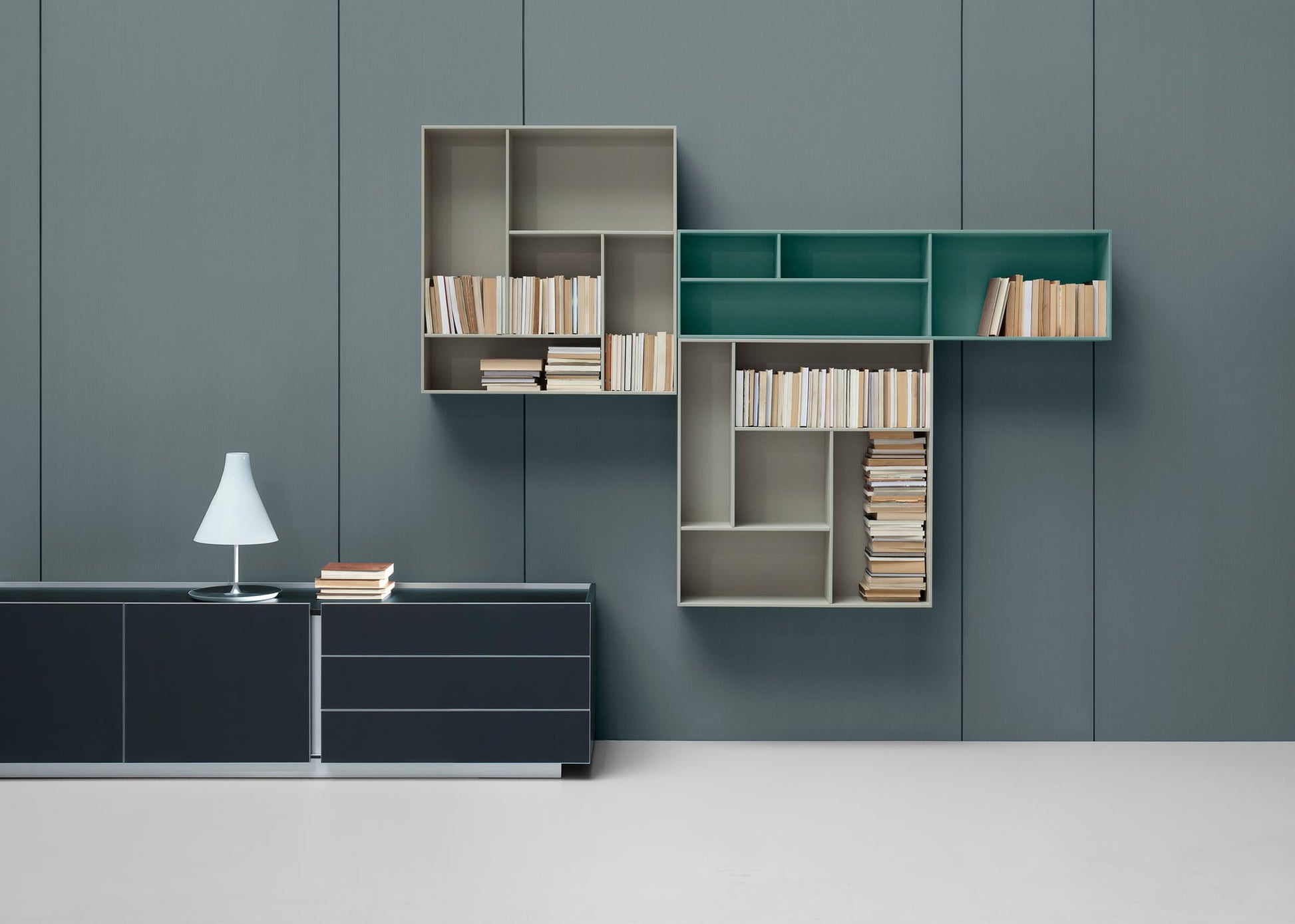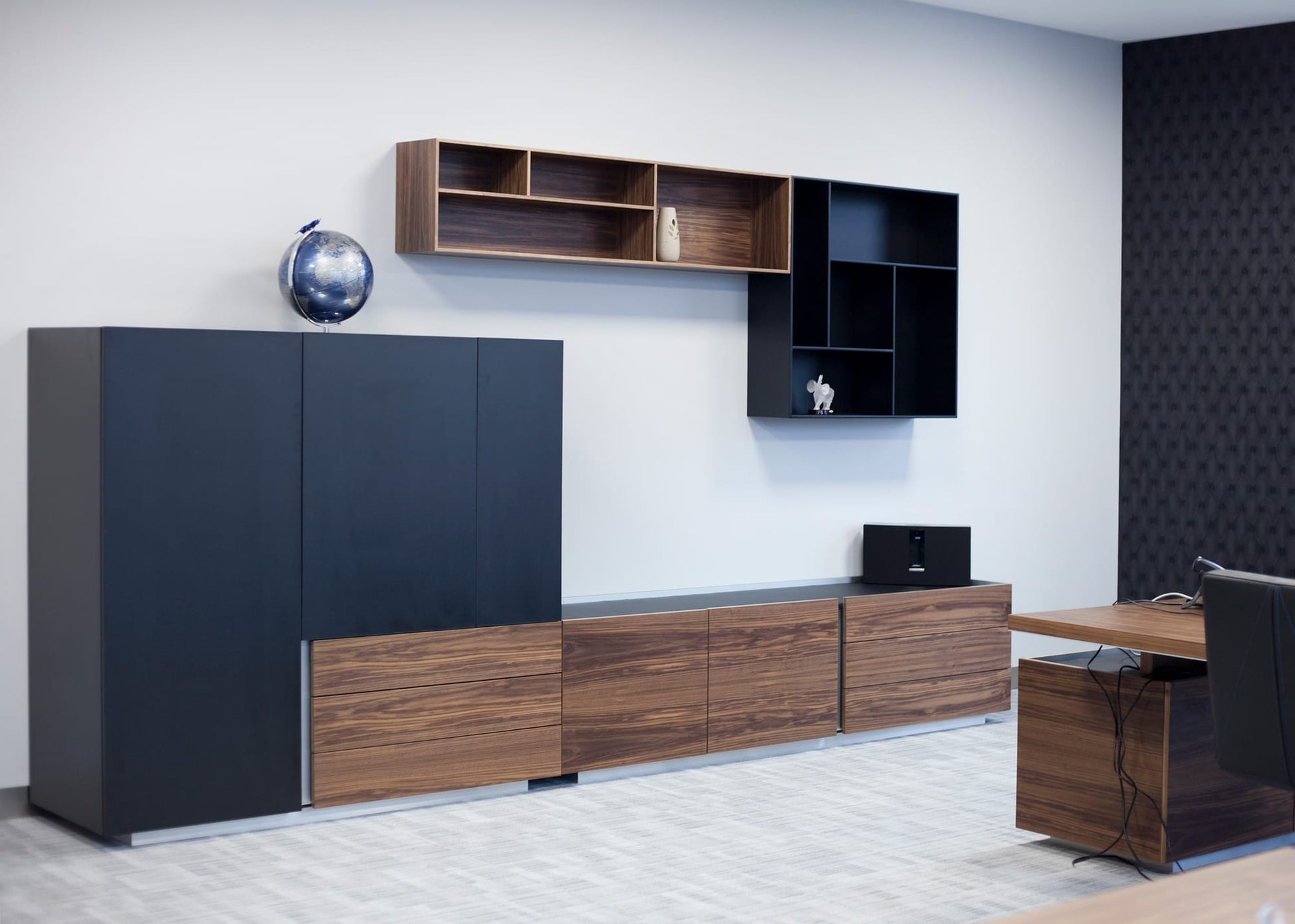 Ostin cabinets are an elegant storage solution. The minimalistic design of the cabinets reflects the absence of handles on the doors and drawers, which are separated by aluminum slots. The element that distinguishes Ostin cabinets is the non-standard finish of the upper crowns, which can be entirely covered in eco-leather. Ostin cabinets come in left or right variants and can also serve as support for desks. They will fit perfectly in places where emphasizing their reputation and uniqueness is important.