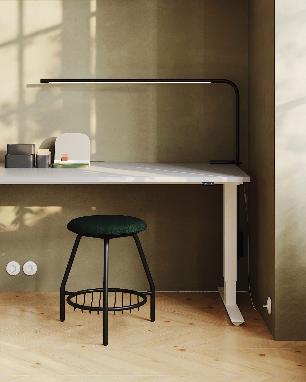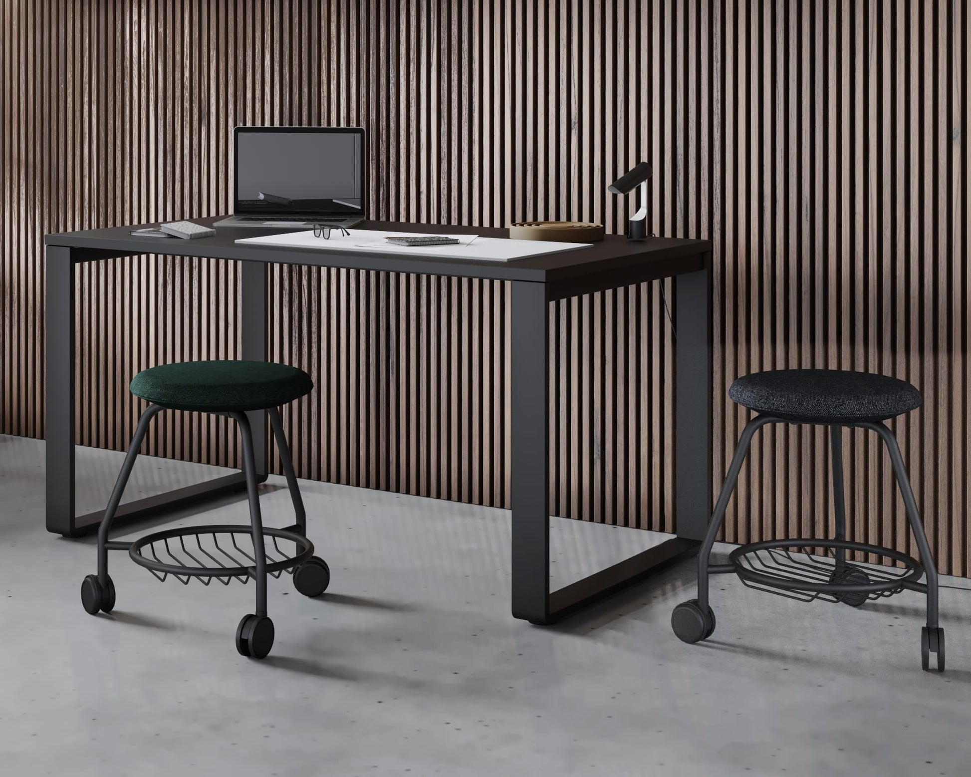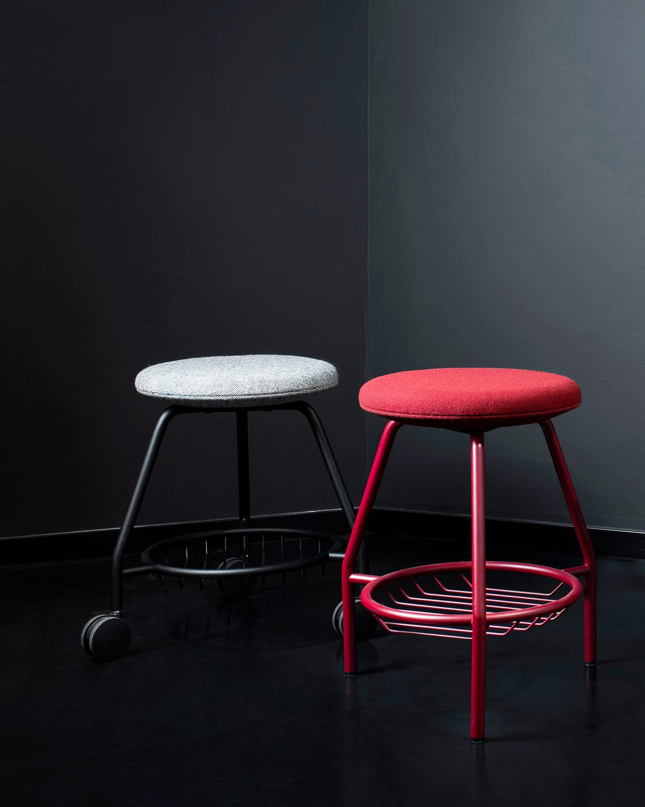 Pung stools go perfectly with Sit and Stand desks. When you feel like working while standing, you can easily move Pung aside and slide it under the desk. It will still look perfect. Pung stools and bar stools combine design and comfort. It is a minimalist form of seating that subtly adds character to any interior. Available with or without wheels.
