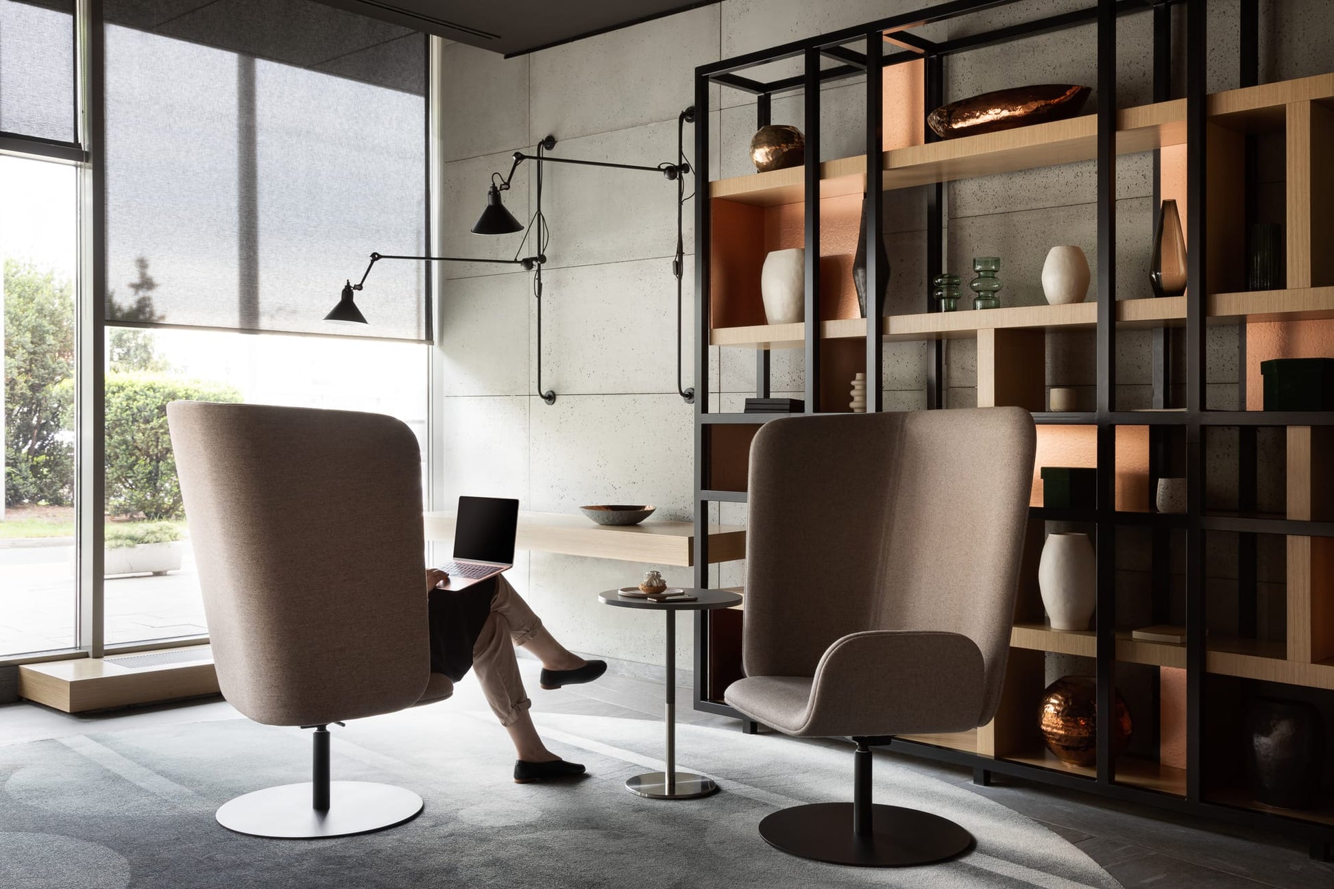 Shieldon is a perfect choice for commercial areas, where the focus is on creating a greater distance between work in open-plan premises. It is ideally suited for hotel and corporate interiors: to furnish lobbies, meeting places or rest-and-relaxation areas, creating a safe and comfortable environment.