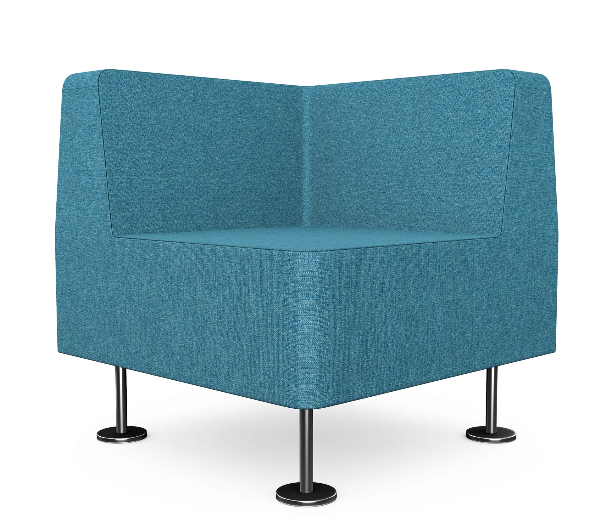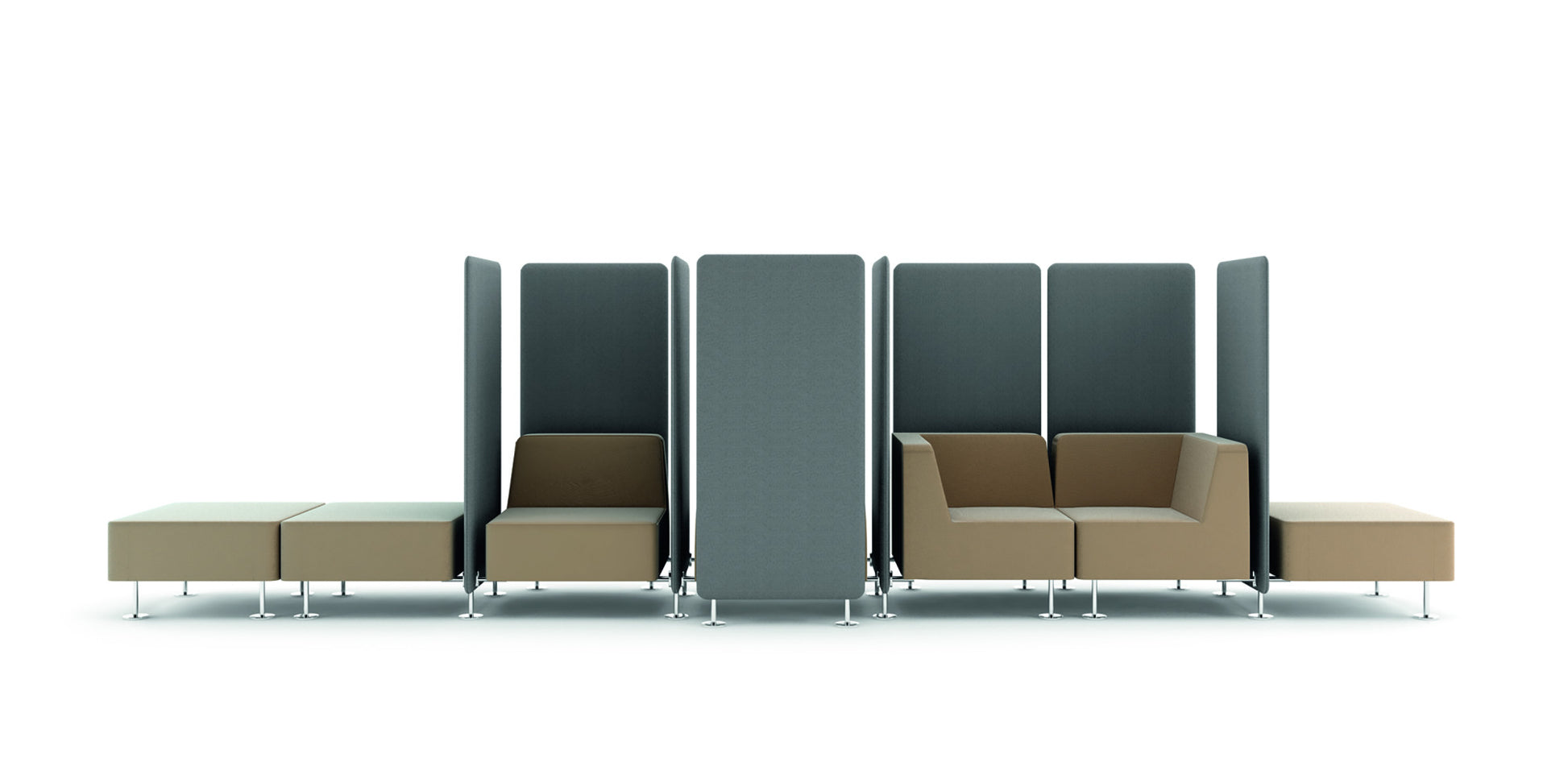 Wall In is a modular seating system characterised by simple geometric forms, suitable for spacious and modern interiors such as halls of public buildings and receptions. The collection has been developed to offer a highly versatile mobile sitting configurations, easily rearranged and adjustable. The family comprises poufs, armchairs, tables and linking units (30 and 60 degrees) completed with partition walls upholstered with structural fabric. The wall fulfills a separating function marking out a space perfect for a private conversation. Legs finished off with esthetic, chromed plates are the eye-catching elements of the furniture.