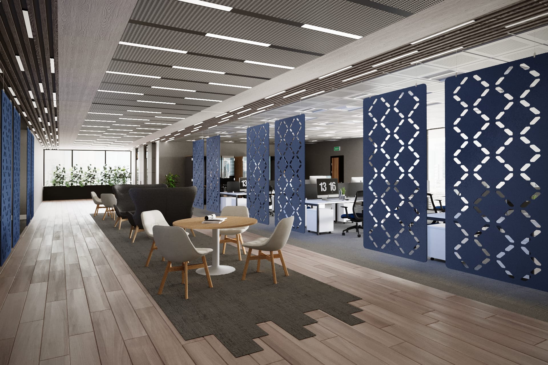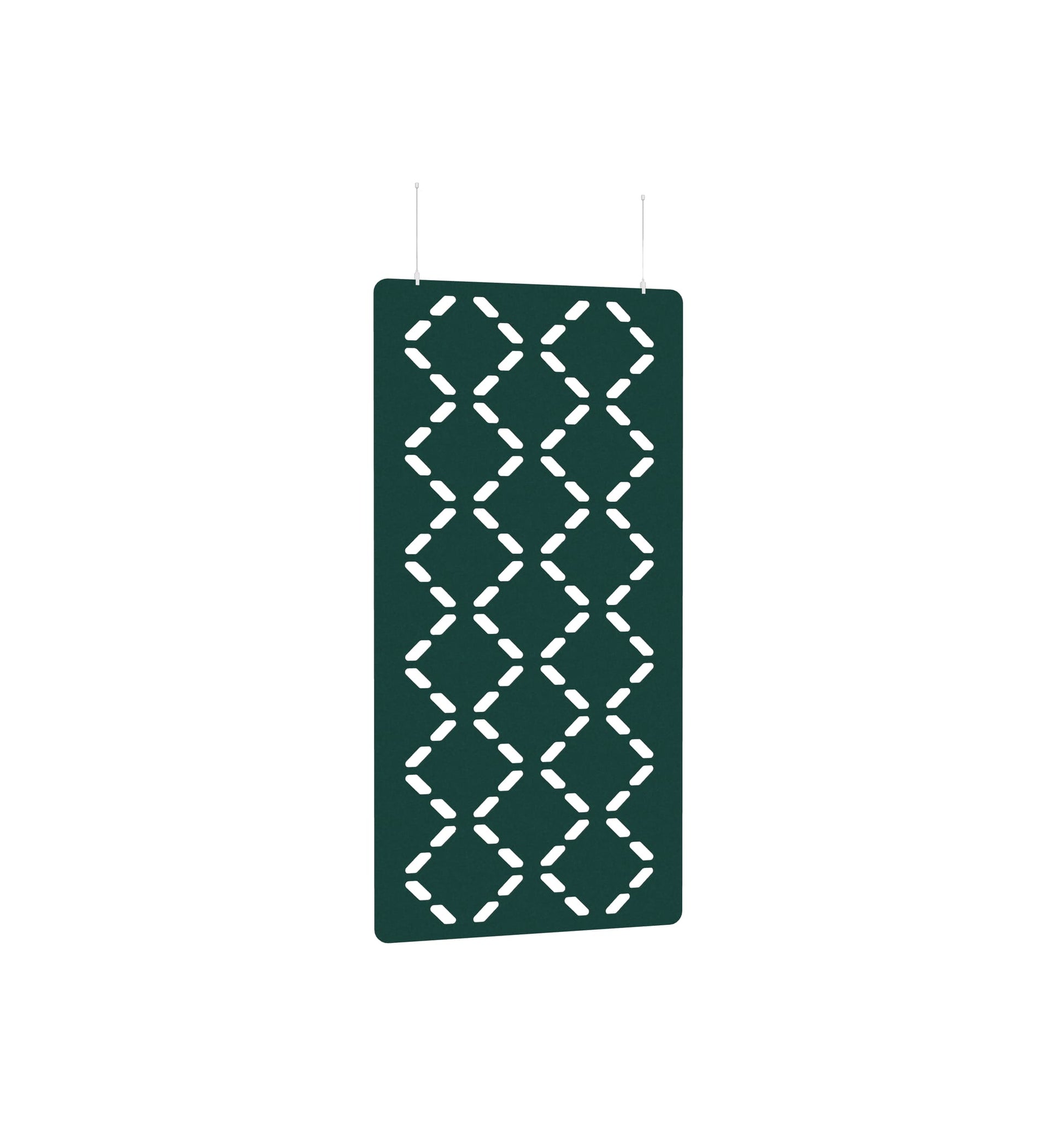 Koala Workspace dividers are made from premium acoustic panels and recycled PET material (recycled bottles) and come in an extensive range of designs and colours. These dividers act as a physical division between spaces within offices or other rooms, whilst also introducing some added acoustic absorption to reduce overall noise. Dividers are suspended from the the ceiling.