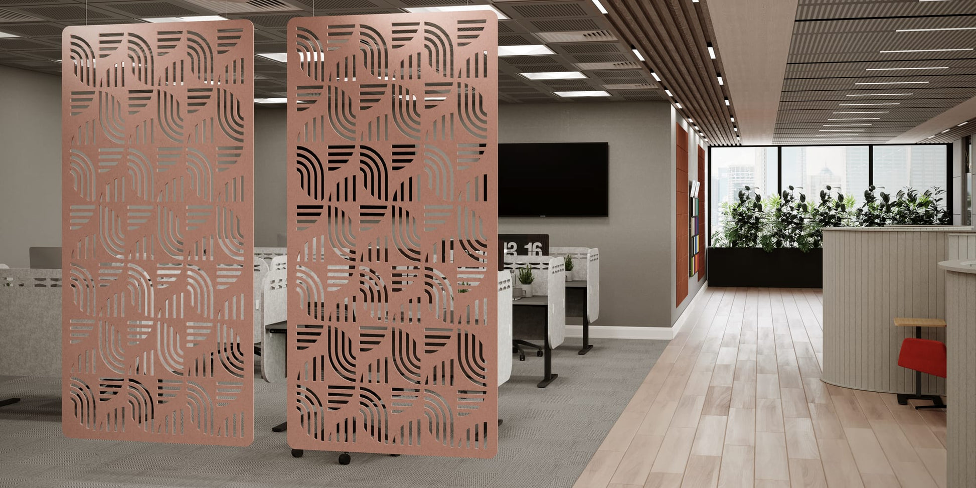 Koala Workspace dividers are made from premium acoustic panels and recycled PET material (recycled bottles) and come in an extensive range of designs and colours. These dividers act as a physical division between spaces within offices or other rooms, whilst also introducing some added acoustic absorption to reduce overall noise. Dividers are suspended from the the ceiling.